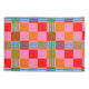 This pillowcase has a mid-century modern design of red, pink, and orange squares and green and blue lines forming a plaid design.