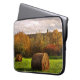 Cette douille d'ordinateur portable de photographie de beaux-arts présente un beau paysage d'automne dans des couleurs saisonnières de feuillage d'automne de rouge, d'orange, de jaune, de brun et de vert. Une tempête a passé et le soleil traverse les nuages sur un champ fauché avec les balles rondes de foin.