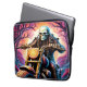 un squelette grippé dans un vélo de pandemonium. Il a un pantalon en cuir noir et des bottes de moto et une veste en cuir noir avec un design osseux sur la tenue de cale.Le soleil couchant derrière lui. La brume qui monte de l'entourage jusqu'à la nuit sombre, il s'éloigne avec des étoiles de nuit au-dessus.
