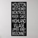 Dieses Poster ist eine Liste der bekanntesten Orte in der Stadt Houston , Texas in Typografie eines modernen Weißen auf klassischem schwarzen Hintergrund. Westheimer ist der Ort, wo die Hotels und großen Einzelhandelsgeschäfte sind, Montrose ist der Künstlerbezirk, River Oaks ist wo das reiche und berühmte Leben, Highland Village ist für hochwertige Einkaufsgeschäfte und Boutiquen, Upper Kirby ist die Elite-Straße und Bissonnet ist der Museumsbezirk.