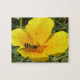 Dieses phantastische Rätsel zeigt ein detailliertes Foto eines herrlichen schwarz-gelb gestreiften Schweblings, der auf einem gelben kalifornischen Mohn herumkrabbelt und nach Nektar sucht.