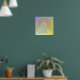 Poster mit Wolf, der auf dem Mond heult. Details zur Illustration: Blumenmandala und Ast, Mondstein Farbe Fell und gelb, grün, violett Farben.