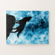 Abstrakter geometrischer Winter schneeblau-weißer Rauch mit schwarzer Wolfskulptur-Silhouette.