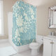 Moderner Duschvorhang mit einem schönen cremefarbenen Blume-Muster und Blätter Set auf blauem Hintergrund.