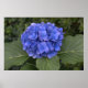 Hübsches nahes Up einer Blue Hydrangea mit ihren zarten Blütenblättern und großen grünen Blätter, die sich im Hintergrund mit unscharfen grünen Sträuchern verteilen. Foto aus unserem Garten. Original Fotografie © TamiraZDesign.