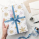 Dieses hübsche Weihnachtsgeschenk hat einen klassischen Stil mit einem schlichten, weißen Hintergrund. Dieses elegante Muster zeichnet sich durch silberne und goldene Schneeflocken und goldene Sterne aus. Perfektes Weihnachtspapier für die ganze Familie.