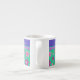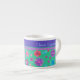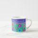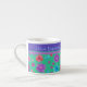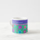 Eine hübsche Espresso-Tasse mit lila, türkisfarbenen, rosa und orangefarbenen Blume auf Jade Green Hintergrund, von Judy Adamson in einer handbemalten PapierCollage. Sie können die Hintergrundfarbe ganz einfach über die Schaltfläche Bearbeiten ändern.