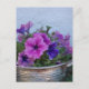 Hübsche, lila und rosa Petunien in einem Vintag silbernen Küchenkopf