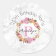 Ein personalisierter Geburtstagsaufkleber, der mit einem Blumenkranz aus rosa und orangefarbenen Blume und Zweigen, Sprigs und Blätter gestaltet wurde. Dieses digitale Bild wurde ursprünglich mit Aquarellen erstellt und ist niedlich und trendig. Der Hintergrund ist ein Bild aus elegantem weißem Marmor. Personalisieren Sie Ihre Daten mit einem Monogramm Initial-, Name- und Ereignistitel.