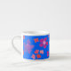 Eine hübsche Espresso-Tasse mit lila, türkisfarbenen, rosa und orangefarbenen Blume auf Sky Blue-Hintergrund, von Judy Adamson in einer handbemalten Papiercollage. Sie können die Hintergrundfarbe ganz einfach über die Schaltfläche Bearbeiten ändern.