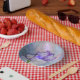 Diese Papierschale weist eine schöne lila Iris vor einem texturierten Hintergrund auf. Ideal zum Geburtstag, Picknick usw.