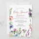 Eine hübsche Einladung für Ihre Babydusche mit einem Rahmen an Aquarellfarben-Wildblumen. Personalisieren Sie alle Ihre wichtigen Daten wie Mama zu Name, Datum, Uhrzeit, Ort, UAWG und Registrierungsinformationen.
