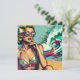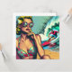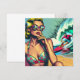 Hübsche Retro-Blondine am Strand sitzend Sonnenbrille, die einen heißen Surfer-Typ in Vintagen Farbtönen in einem Pop Art Comic Stil sieht.