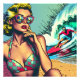 Hübsche Retro-Blondine am Strand sitzend Sonnenbrille, die einen heißen Surfer-Typ in Vintagen Farbtönen in einem Pop Art Comic Stil sieht.