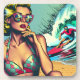Hübsche Retro-Blondine am Strand sitzend Sonnenbrille, die einen heißen Surfer-Typ in Vintagen Farbtönen in einem Pop Art Comic Stil sieht.