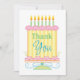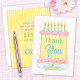 Eine große, gelb gestreifte Geburtstagstorte mit rosafarbenen Blume und grünen Kerzen, die Ihnen helfen, Ihre Wertschätzung auszudrücken.