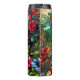 Farbenfrohe Trommel mit hübscher Dame in Sonnenbrille im Blumengarten in Rosa und Grün.