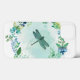 Eine wunderschöne Libelle mit einer Grenze aus einer Mischung von blauen, aquamarinen und grünen Aquarellen, bemalten Blume und Schmetterlingen.