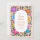 Diese prächtige Osterfeier-Einladung zeigt ein handgezeichnetes Blumendesign in magenta / fuchsienrosa, orange, goldgelb, lila, blau und grün auf einem farblich angepassten Hintergrund (in hellpfirsichfarben dargestellt). Ein ovaler Rahmen ermöglicht es, den passenden orangefarbenen Text zu unterscheiden. *Kunstwerke, die ausschließlich von Orabella Prints erstellt wurden