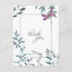 Dieses hübsche Dankeschön an die Postkarte zeigt zwei Aquarelldrachenfliegen, eine in Blau- und Grüntönen mit leuchtenden Flügeln und die andere mit Flügeln in lila und rosa Tönen. Sie befinden sich in einer einfachen Anordnung von Grünpflanzen in den Farben Grün, Blau, Grau und Braun mit weißem Hintergrund.