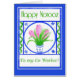 Eine hübsche persische Neujahrskarte, für Co-Worker', mit einem blauen und weißen Topf aus rosa Hyazinthen in blauer Farbe und Happy Norooz in grün, aus einem Aquarellbild von Judy Adamson. Eine benutzerdefinierte Frontversion dieses Designs ist ebenfalls verfügbar, und Sie können die innere Nachricht dieser Karte personalisieren, wenn Sie möchten.