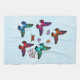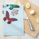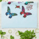 Ein Küchentuch mit eleganten, flatternden Schmetterlingen in vielen hellen Farben, wie grün, orange, blau, rot und rosa. Whimsikale Blumen fügen eine skurrile Touch hinzu. Set auf einem hellblauen Aquarell.