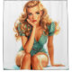 Dieser Duschvorhang hat eine hübsche Dame darauf.