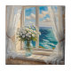 Eine hübsche Vase aus Blume auf einem Tisch vor einem Fenster mit Blick auf den Ozean. Schere weiße Vorhänge blasen in der Brise. Ai Art.