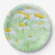 Papier Teller mit einem frischen und sommerlichen Foto mit einer Sammlung von wilden Molen mit großen gelben Zentren, die auf einem grünen Feld wachsen.
