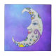 Diese Keramik dekorative Kachel hat einen weißen Halbmond mit einem hübschen Gesicht, das mit abstrakten Formen in leuchtenden Farben von blau, gelb und lila mit drei Sternen auf einem lila Himmelshintergrund dekoriert ist.