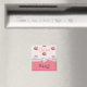 Hübscher Küchenspulenmagnet, oben mit einem rosa Rosenmuster auf einem rosa und weiß gestreiften Hintergrund, und am unteren Ende des Magneten ein dunkelrosa mit weißen Polka-Punkten. Die Grafik eines weißen Bandes und Bogens verläuft in der Mitte. Grau und rosa Text lautet Clean and Dirty. Macht ein großartiges Geschenk für die Gastgeberin.