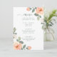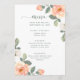 Diese hübsche Hochzeitsmenükarte besticht durch trendige pfirsichweiße Blume mit vielen grünen Blätter und moderne Schriftzeichen auf weißem Hintergrund.