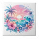 Hübsche tropische Oasis Kachel. Wunderschöne pastellrosa und blaue Küstenkunst mit Palmen, tropischen Blume, Sonnenuntergang und Meereswellen. Hübsche tropische Kunst, um Ihrer Zuhause ein Strandgefühl zu geben!