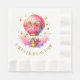 Rosa und goldfarbene personalisierte Geburtstagsparty-Papierservietten mit einem hübschen Heißluftballon und einem Korb voller Geschenke.
