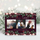 Die hübsche Weihnachtsfoto-Card mit der eleganten, blumengeschmückten und blumengeschmückten. Botanisches Blumenmuster in gedämpften Pastellfarben Rosa Grün und Rot auf einem dunkelburgundischen Hintergrund Feiertag Foto Weihnachtskarte. Dazu gehören botanische Kiefern, Blume, Krabben, Blätter, Beeren und Knospen, sowie moderne Typografie in Weiß, Lesen, "Frohe Weihnachten". Original-Kunstwerk von Caroline Bonne Müller