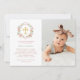 Diese wunderschöne Taufe oder Weihnachten-Einladung besticht durch einen Kranz mit hübschen, rosa Rose mit grünen Blätter und ein goldenes Kreuz aus Imitaten in der Mitte. Pinkfarbener Text und das Foto Ihres Babys passen auch auf einem schlichten, weißen Hintergrund. Die Rückseite der Karte hat einen hübsch rosa Blumenrand.