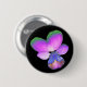 Dieser Button zeigt ein Foto einer wilden Pansy-Blume. Das Foto wurde künstlich gefärbt, was zu einer Panik mit leuchtenden rosa lila Blütenblättern mit grünen Spitzen-Blättern und einem tiefblauen Zentrum führt. Der Hintergrund ist schwarz, um die Blume zu heben.