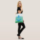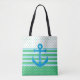 Hübsch überall drucken Tasche in einem grünen, himmelblauen und weißen nautischen Thema. Die Streifen, die durch die Mitte der Tasche laufen, mit koordinierenden Polka-Dot-Mustern schmücken den oberen und unteren Rand der Tasche. Ein großer Himmelblau-Anker schmückt die Mitte der Tasche, mit einem benutzerdefinierten weißen Text bereit, um zu personalisieren. Super Sommer Tasche für jeden Geschmack.
