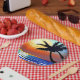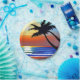 Geburtstagsparty-Teller. Vintage Farben Palmen Silhouette und Ozeanwellen auf einem Sandstrand ai generierte Kunstwerke.