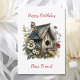 Geburtstagskarte für einen Freund. Niedliches rustikales Vogelhaus mit niedlichem Vogeldach, umgeben von hübschen Blume.