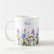 Wildblume Kaffee Tasse Aquarell, können Sie mit Ihrem Namen, mit modernen Schriftart Typografie personalisieren. Trendfarbene, wilde Blume in Blautönen, lila und gelb. Girly und feminine Hütte Garden Design - Sie werden Ihre Tasse für Zuhause, Business, Schule, Universität oder für ein Geschenk Liebe