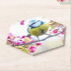 Untersetzer aus Papier mit einem phantastischen Foto des niedlichsten kleinen Vogels auf einem Zweig, der mit rosa Blüten und grünen Blätter bedeckt ist. Der Vogel hat einen blauen Kopf und einen gelben Körper mit einem sehr süßen Gesicht. Schön.