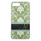 Elegantes dunkles Olivgrün- und weißesblumendamastmuster mit Monogramm. Schöne Telefon-Hüllen. Addieren Sie Ihren eigenen Namen und Monogramm. Fertigen Sie den angenommenen Antrag kundenspezifisch an. Klicken Sie " an; contact" über mir eine Mitteilung schicken.