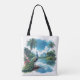 Ein atemberaubender Pfau steht anmutig und blickt über ein üppiges tropisches Paradies in diesem schönen Design.