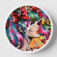 Farbenfrohe niedliche Pop Art Comic Mädchen mit Ferkeln und Bogen in ihren Haaren.