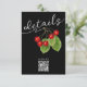 Diese elegante zweiseitige Hochzeitszimmerkarte zeigt eine Vintage botanische Abbildung von kräftigen Rothirschen mit grünen Blätter, die elegant über dem Wort "Details" in stilvoller weißer Kalligrafie hängen, alles Set vor einem schlichten schwarzen Hintergrund. Ein moderner schwarz-weißer QR-Code ermöglicht Ihnen den einfachen Zugriff auf Ihre Hochzeitswebsite oder Ihr digitales Marketing. Die Rückseite zeigt elegantes Schwarz-Rot-Skript auf einem sauberen weißen Hintergrund. Vollständig anpassbar, können Sie Text- und QR-Codes durch Ihre eigenen Daten ersetzen. Ideal für eine rustikale Hochzeit im Freien, erkunden Sie unsere Cherry Wedding Collection für passende Produkte, um Ihr Thema zu vervollständigen.