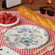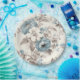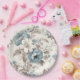 Sehr schöne Blume im blauen und cremefarbenen Boho-Stil mit hellbraunem Blattwerk auf Aubergschalen-Hintergrund.