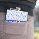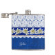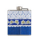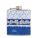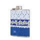 Hübscher Alkoholkolben, blau auf blauem Damast-Muster gefertigt, mit einer weißen Spitze übermäßig auf der oberen Hälfte des Kolben. Die Grafik eines blau satin aussehenden Farbbands mit weißer Edelweiß-Blume verläuft in der Mitte. Personalisieren Sie den weißen Text auf der Vorderseite, für sich selbst oder als charmante Geschenkidee.