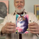 Hübsche, flache Grußkarte zeigt das Portrait einer Maine Coon Katze mit rosa Rosen. Digitale Malerei mit KI-Software erstellt.