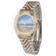 Diese wunderschöne Armbanduhr ist perfekt für den Sommerurlaub an der Küste. Kleine blaue Wellen reihen sich unter hübschen Wolken an einem herrlichen Strand hoch. Ich Liebe Urlaub am Meer.